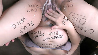 Nine month pregnant cheating wifey Milky Mari gets covered by body writings in dirty bukkake roleplay gangbang!