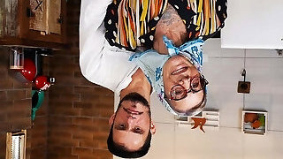 A bald, bearded and fur covered male is aggressive to his sexy mature wifey for the amusement of people))