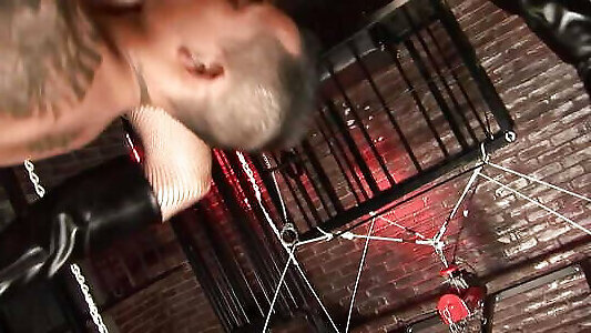 Blond Mistress Sharon open the cage of her asian slave boy and take him out for bizarre camera man fuxker in dungeon.