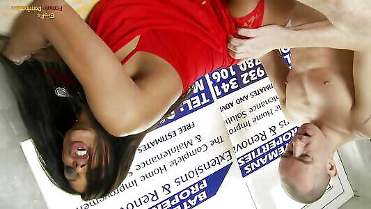 Brunette in a red dress and stockings gets her pussy eaten and fucked
