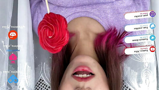 Tonguing a knob with her pierced tongue and wanking it off